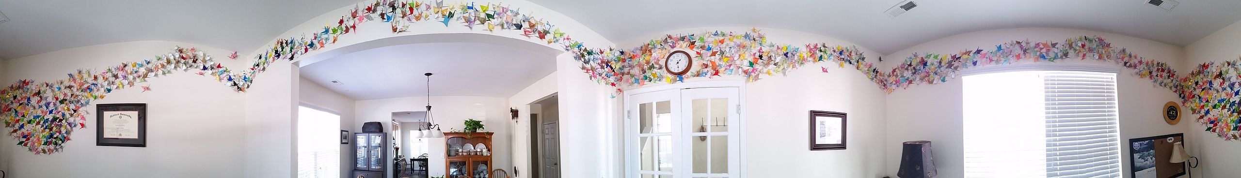 1000 cranes, taped around the room that served as my home office. I folded almost all of these while sitting in meetings, on the phone, largely idle. If I'm bored and my hands are on a keyboard, I've left the meeting. If my hands are still, I fall asleep, and I've left the meeting.